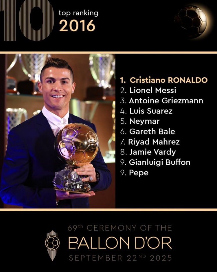 8月25日,金球奖官方通过社交媒体发布了2016年度金球奖排名前十的回顾,C罗荣获第一,梅西位列第二。