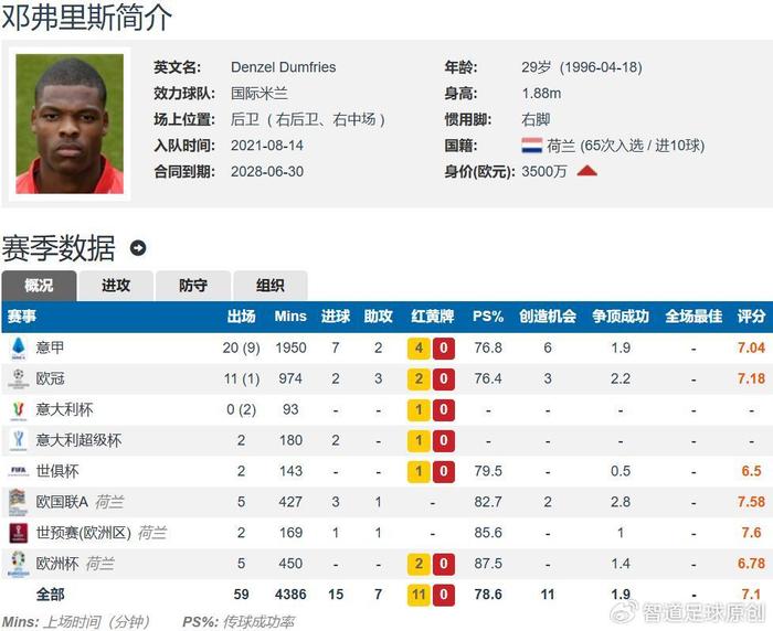 现年29岁的邓弗里斯,身高1.88米,右脚球员,主打右后卫,与国际米兰的合同至2028年。邓弗里斯上赛季各项赛事共为国际米兰出场45次,其中33次首发,贡献11球5助,这数据对于后卫而言已经非常犀利,2025世俱杯有过2次出场。