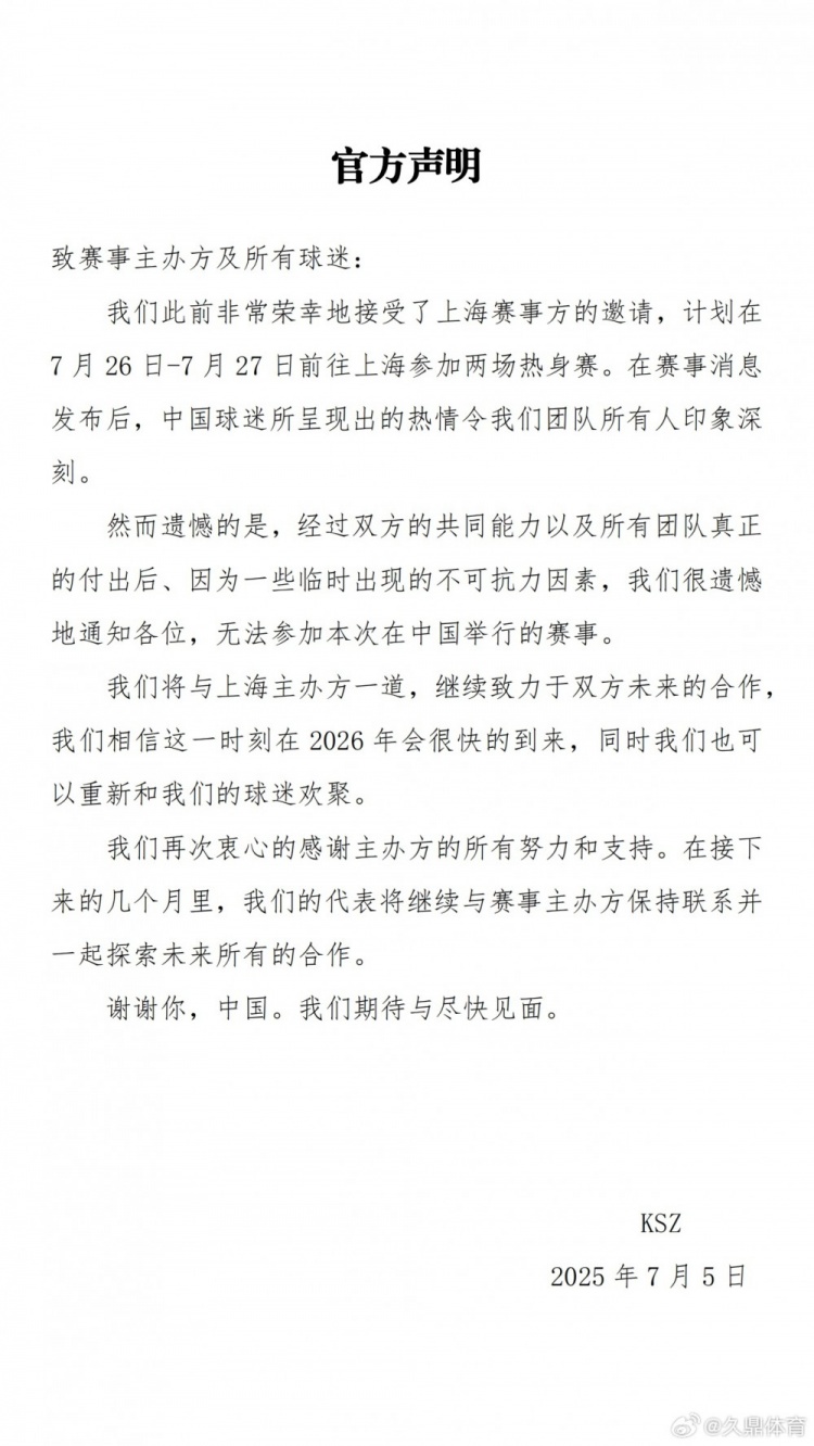 官方消息显示,目前已经收到斯洛文尼亚和英国篮协的官方声明,因两国球队遭遇不可控的突发情况,经多方努力协调,仍无法按计划今夏来沪。