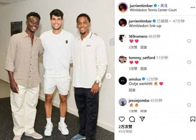 阿森纳球员廷伯和萨卡也现场观看了本场比赛,前者也晒出他们和阿尔卡拉斯的合照并配文:“温网公开赛。”